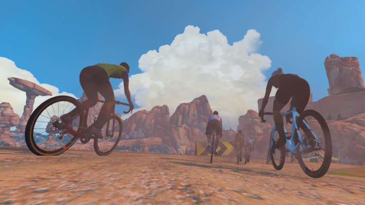 Launching on April 6th, there will be a new event-only gravel circuit, in a “red-rock environment” as seen above/below. Zwift says this route will include ultra-wide roads, corner berms, and more, and is designed specifically for gravel bikes (in terms of selecting to ride those bikes within the game). This is a short-format circuit, designed for multiple loops.