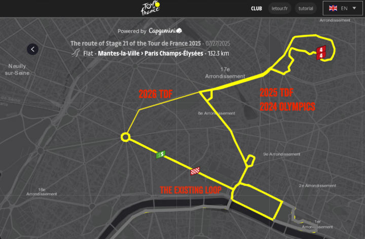 I’ve mocked up on the Tour de France 2025 route the pieces that are totally new, previously new, and forever existing. I’ve greyed out the non-relevant parts.