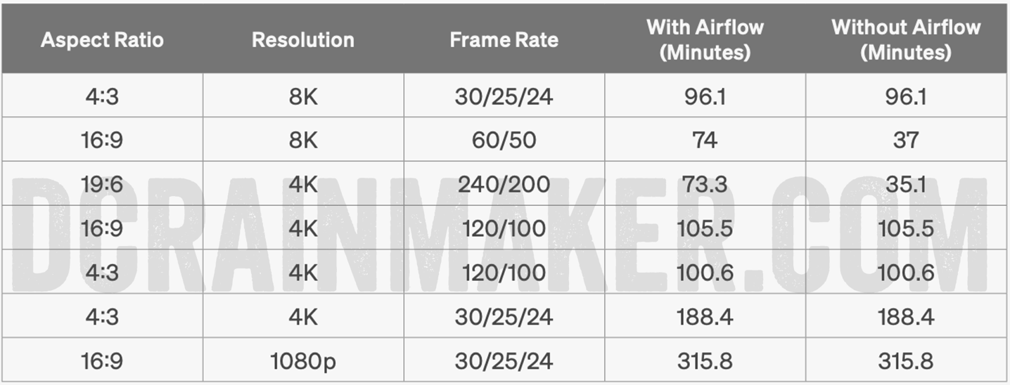 Now, obviously, this isn’t a full review. As such, I haven’t tested everything yet. And more importantly, the firmware isn’t final yet, that’s still a few weeks away (since the camera doesn’t start shipping for another 5 weeks). Still, on the random beta firmware I have, I tested out 4K/30 outside in the sun, and got the 3 hours it spec’d at above. Likewise, I also tested 8K/30 (16:9 outside just prior to sunset and it got 1hr 25mins (so about 11 minutes longer than spec, but spec technically calls for 4:3 which would consume more battery). The temp was basically 70*F/21*c with still air. All settings left at default, and GPS/Bluetooth both on.