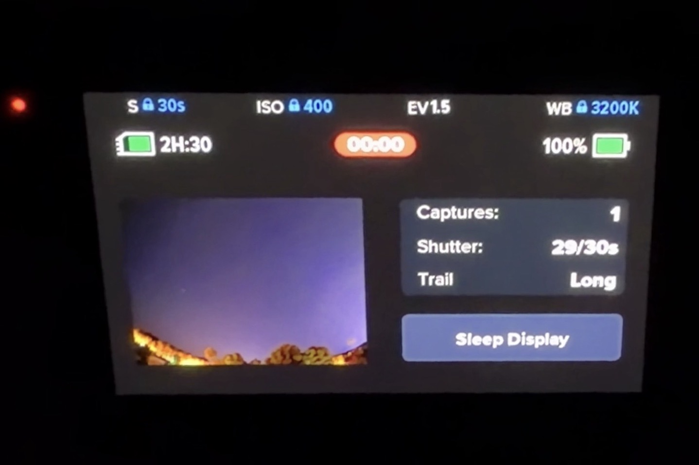 Moving on, I totally forgot to list two things in my video I meant to list. First up is that there’s a nifty new screen on the Night Effects page, which shows you a preview in real time of the effects, specifically of the Star Trails. This way after the first 30 seconds, you can see whether or not you’re vaguely in the right position for the shot. Here’s a hand-held cell-phone photo in the dark of the back of the screen atop my roof, so you can roughly understand what I mean: